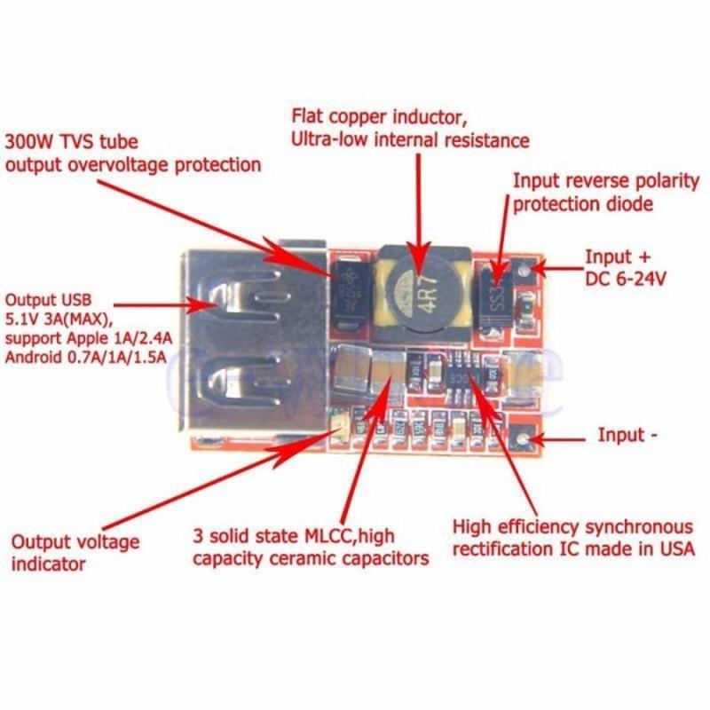 Tämä pienikokoinen stepdown muunnin muuntaa tulojännitteen 6–24V – 5 V USB-lähdöllä ja 3 A virralla.