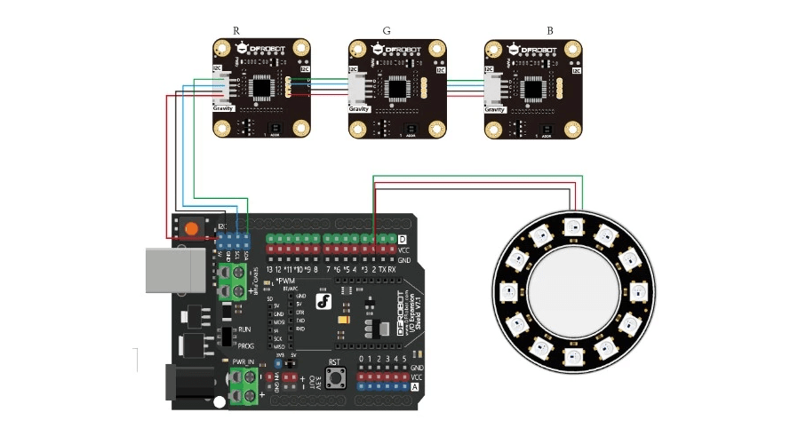 Esimerkkikaavio RGB LEDin ohjauksesta kolmella encoderilla